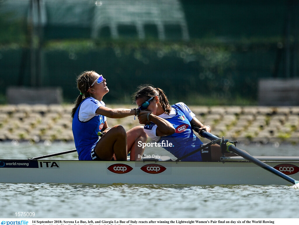 14 September 2018; Serena Lo Bue, left, and Giorgia Lo Bue of Italy reacts after winning the Lightweight Women's Pair final on day six of the World Rowing Championships in Plovdiv, Bulgaria. Photo by Seb Daly/Sportsfile