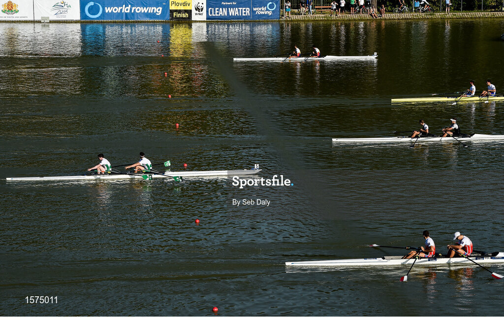 14 September 2018; Ronan Byrne and Philip Doyle of Ireland, left, on their way to finishing fifth in their Men's Double Sculls semi-final on day six of the World Rowing Championships in Plovdiv, Bulgaria. Photo by Seb Daly/Sportsfile