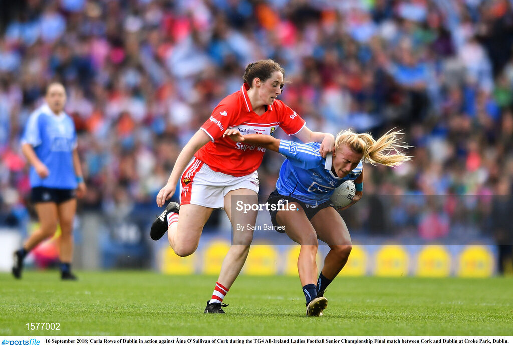 16 September 2018; Carla Rowe of Dublin in action against Áine O'Sullivan of Cork during the TG4 All-Ireland Ladies Football Senior Championship Final match between Cork and Dublin at Croke Park, Dublin. Photo by Sam Barnes/Sportsfile
