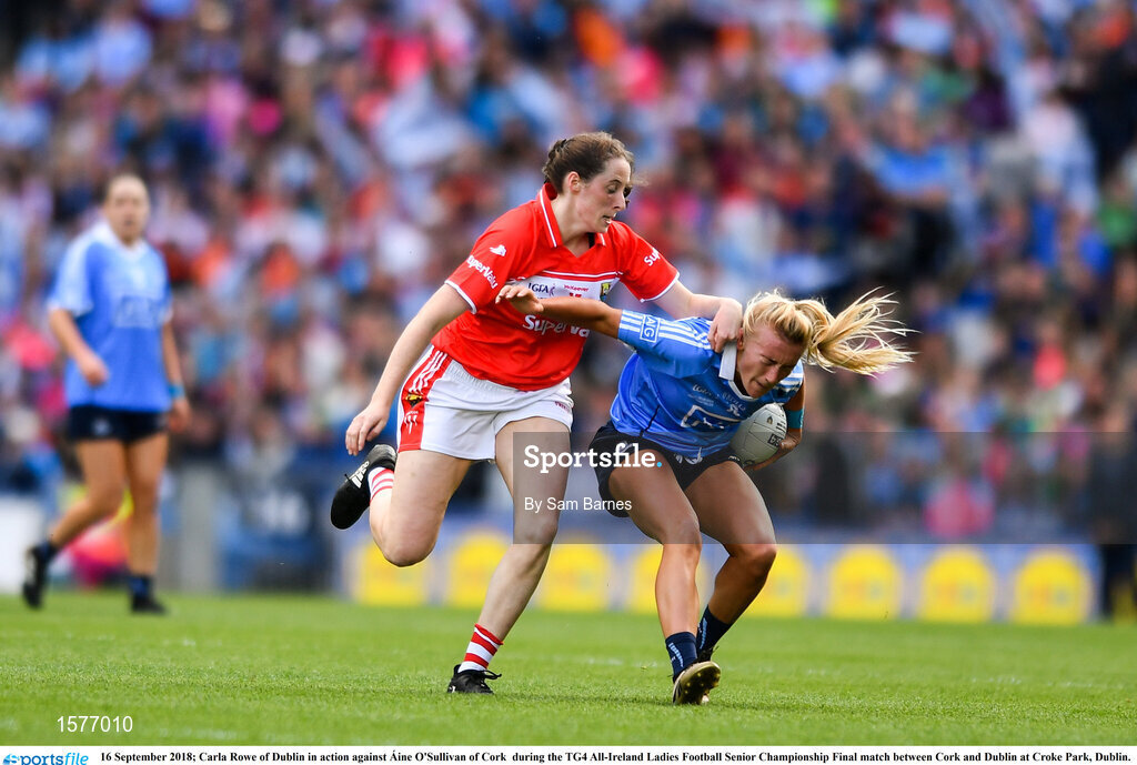 16 September 2018; Carla Rowe of Dublin in action against Áine O'Sullivan of Cork during the TG4 All-Ireland Ladies Football Senior Championship Final match between Cork and Dublin at Croke Park, Dublin. Photo by Sam Barnes/Sportsfile