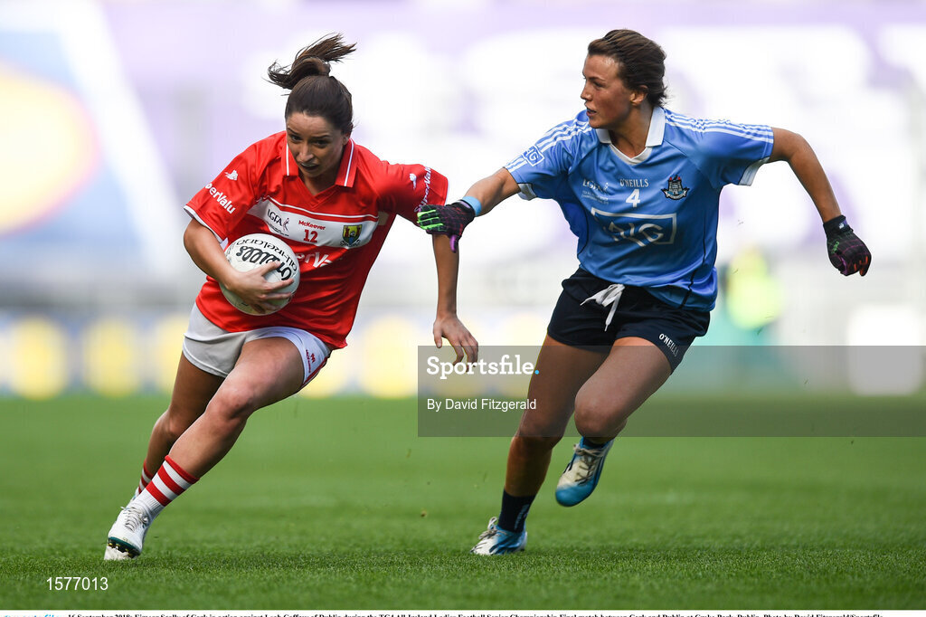 16 September 2018; Eimear Scally of Cork in action against Leah Caffrey of Dublin during the TG4 All-Ireland Ladies Football Senior Championship Final match between Cork and Dublin at Croke Park, Dublin. Photo by David Fitzgerald/Sportsfile