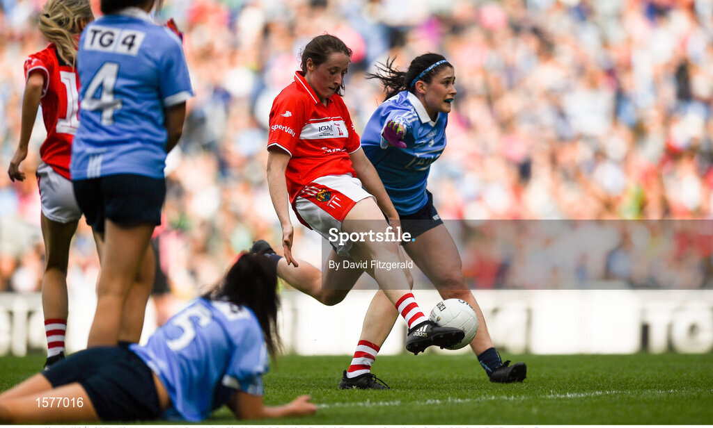 16 September 2018; Áine O'Sullivan of Cork shoots to score her side's first goal during the TG4 All-Ireland Ladies Football Senior Championship Final match between Cork and Dublin at Croke Park, Dublin. Photo by David Fitzgerald/Sportsfile
