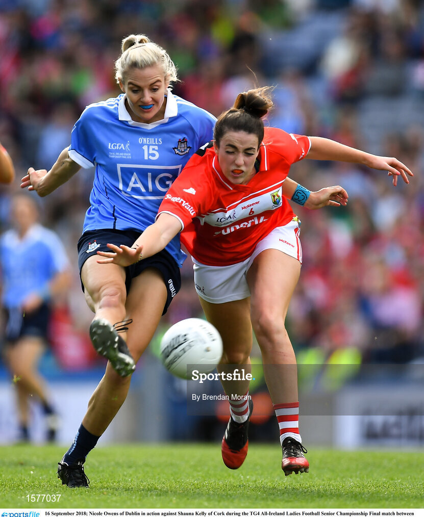 16 September 2018; Nicole Owens of Dublin in action against Shauna Kelly of Cork during the TG4 All-Ireland Ladies Football Senior Championship Final match between Cork and Dublin at Croke Park, Dublin. Photo by Brendan Moran/Sportsfile