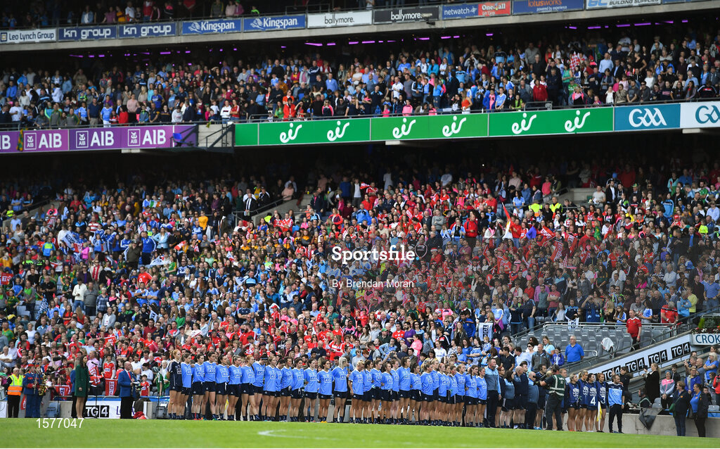 16 September 2018; The Dublin team stand for the national anthem prior to the TG4 All-Ireland Ladies Football Senior Championship Final match between Cork and Dublin at Croke Park, Dublin. Photo by Brendan Moran/Sportsfile