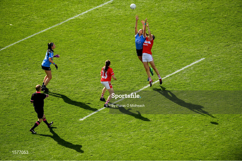 16 September 2018; Referee Garryowen McMahon watches as Niamh McEvoy of Dublin contests the throw-in at the start of the first half with Hannah Looney of Cork during the TG4 All-Ireland Ladies Football Senior Championship Final match between Cork and Dublin at Croke Park, Dublin. Dublin's Olwen Carey and Cork's Áine O’Sullivan await developments. Photo by Piaras Ó Mídheach/Sportsfile