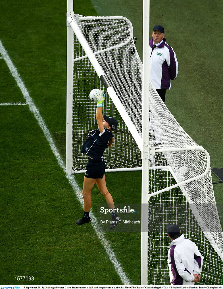 16 September 2018; Dublin goalkeeper Ciara Trant catches a ball in the square from a shot by Áine O’Sullivan of Cork during the TG4 All-Ireland Ladies Football Senior Championship Final match between Cork and Dublin at Croke Park, Dublin. Photo by Piaras Ó Mídheach/Sportsfile