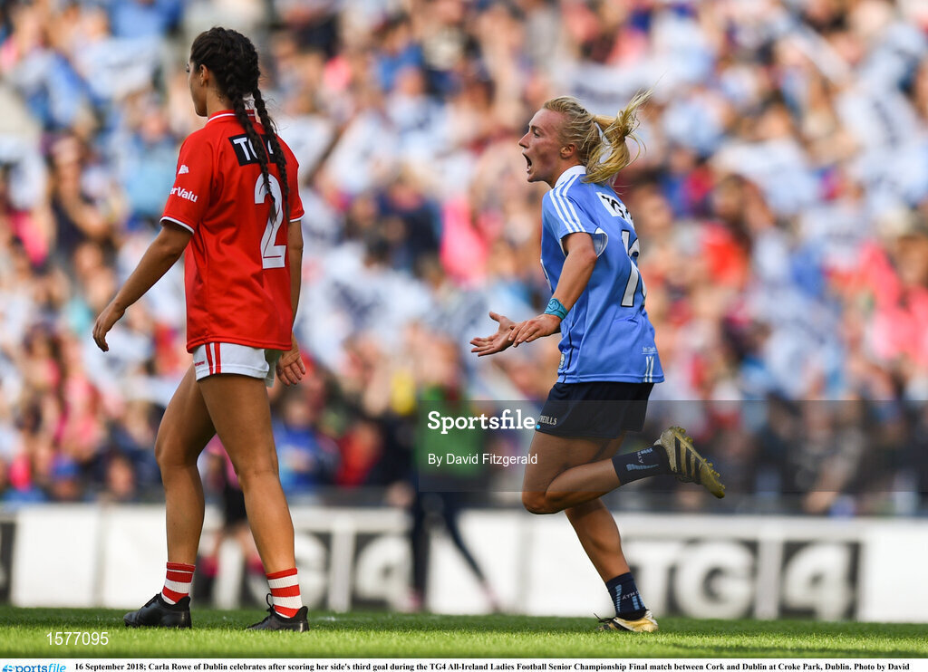 16 September 2018; Carla Rowe of Dublin celebrates after scoring her side's third goal during the TG4 All-Ireland Ladies Football Senior Championship Final match between Cork and Dublin at Croke Park, Dublin. Photo by David Fitzgerald/Sportsfile