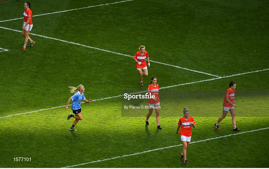 16 September 2018; Carla Rowe of Dublin celebrates scoring her side's third goal as Cork players look on dejected during the TG4 All-Ireland Ladies Football Senior Championship Final match between Cork and Dublin at Croke Park, Dublin. Photo by Piaras Ó Mídheach/Sportsfile
