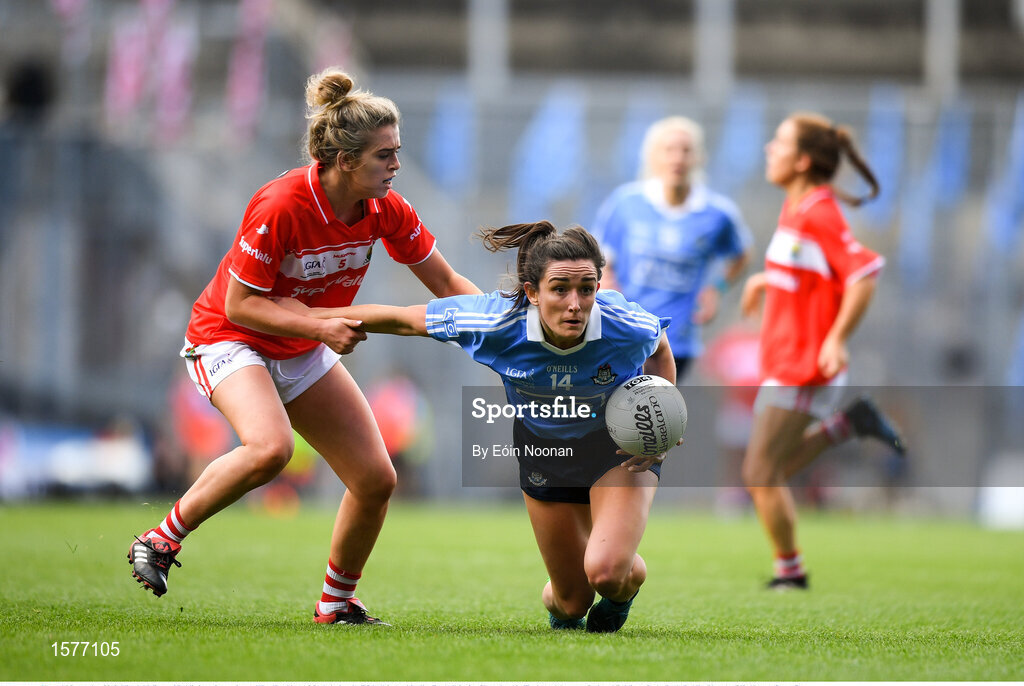 16 September 2018; Niamh McEvoy of Dublin in action against Ashling Hutchings of Cork during the TG4 All-Ireland Ladies Football Senior Championship Final match between Cork and Dublin at Croke Park, Dublin. Photo by Eóin Noonan/Sportsfile