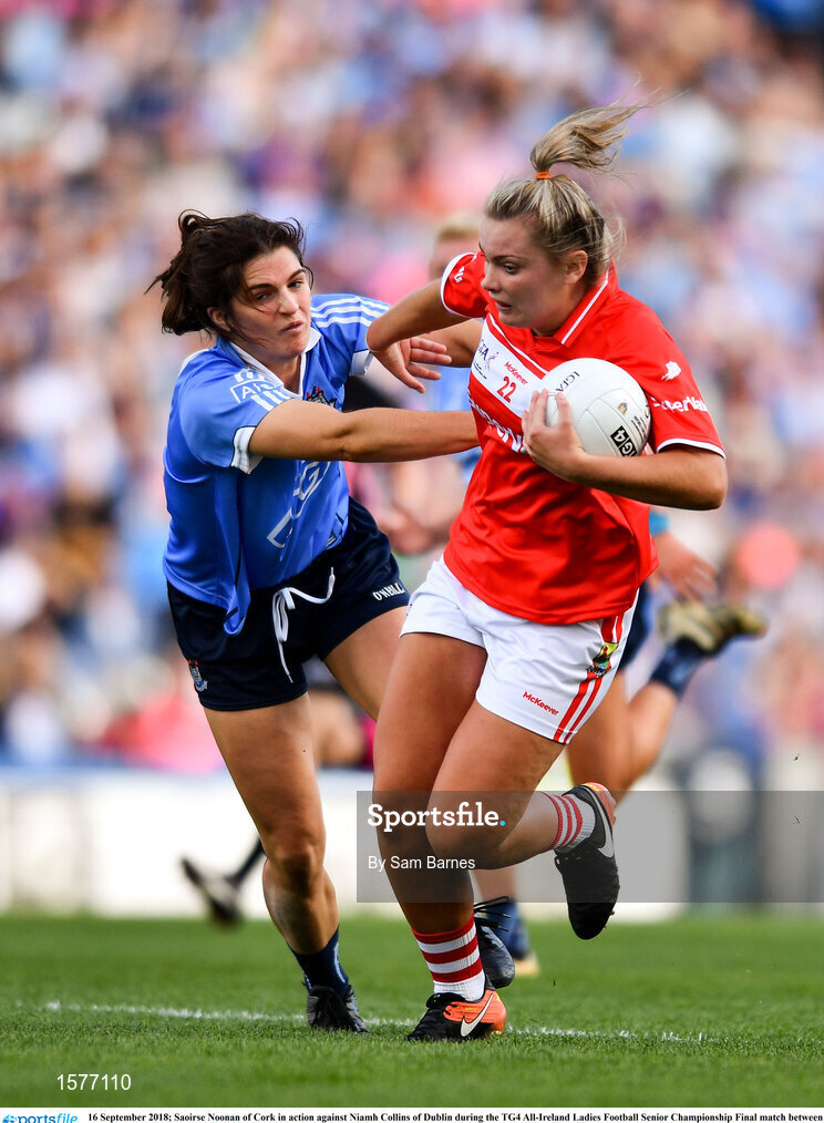 16 September 2018; Saoirse Noonan of Cork in action against Niamh Collins of Dublin during the TG4 All-Ireland Ladies Football Senior Championship Final match between Cork and Dublin at Croke Park, Dublin. Photo by Sam Barnes/Sportsfile