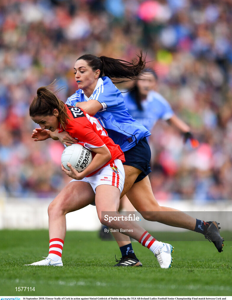 16 September 2018; Eimear Scally of Cork in action against Sinéad Goldrick of Dublin during the TG4 All-Ireland Ladies Football Senior Championship Final match between Cork and Dublin at Croke Park, Dublin. Photo by Sam Barnes/Sportsfile