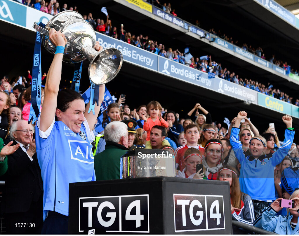 16 September 2018; Dublin captain Sinead Aherne lifts the Brendan Martin Cup after the TG4 All-Ireland Ladies Football Senior Championship Final match between Cork and Dublin at Croke Park, Dublin. Photo by Sam Barnes/Sportsfile