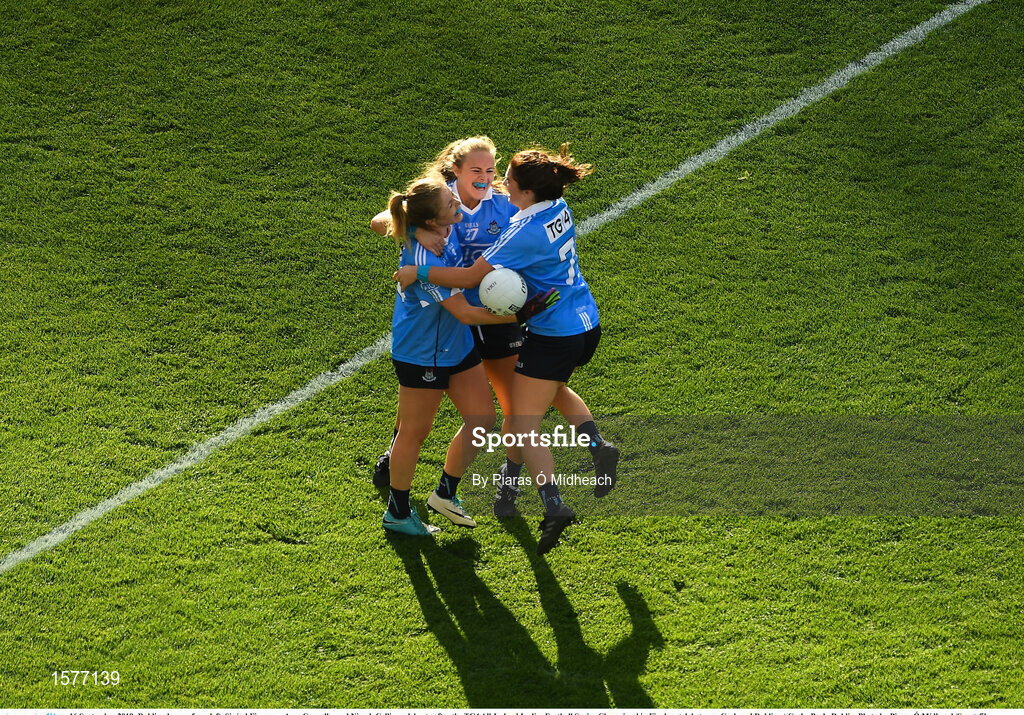 16 September 2018; Dublin players, from left, Sinéad Finnegan, Amy Connolly, and Niamh Collins celebrate after the TG4 All-Ireland Ladies Football Senior Championship Final match between Cork and Dublin at Croke Park, Dublin. Photo by Piaras Ó Mídheach/Sportsfile