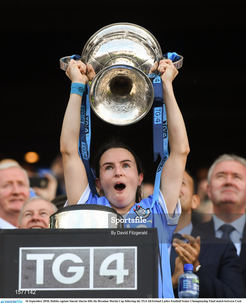 16 September 2018; Dublin captain Sinead Aherne lifts the Brendan Martin Cup following the TG4 All-Ireland Ladies Football Senior Championship Final match between Cork and Dublin at Croke Park, Dublin. Photo by David Fitzgerald/Sportsfile
