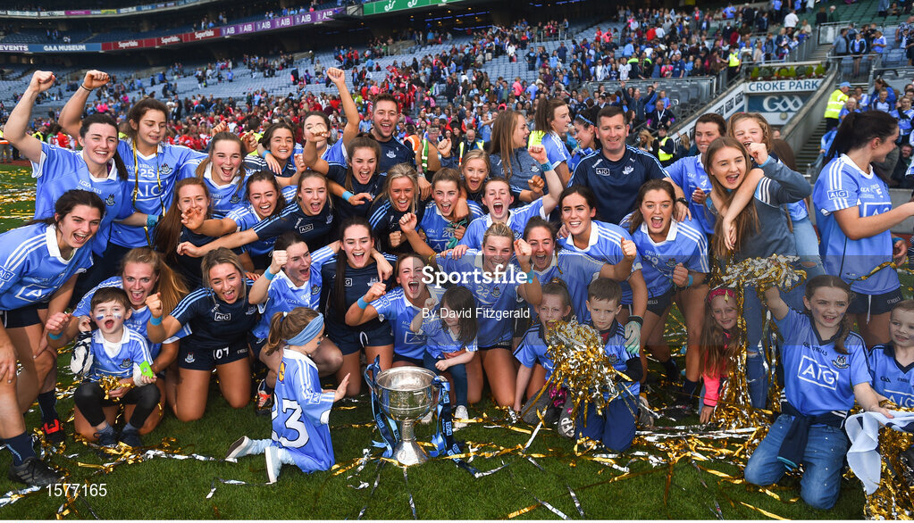 16 September 2018; The Dublin team celebrate with the Brendan Martin cup following the TG4 All-Ireland Ladies Football Senior Championship Final match between Cork and Dublin at Croke Park, Dublin. Photo by David Fitzgerald/Sportsfile