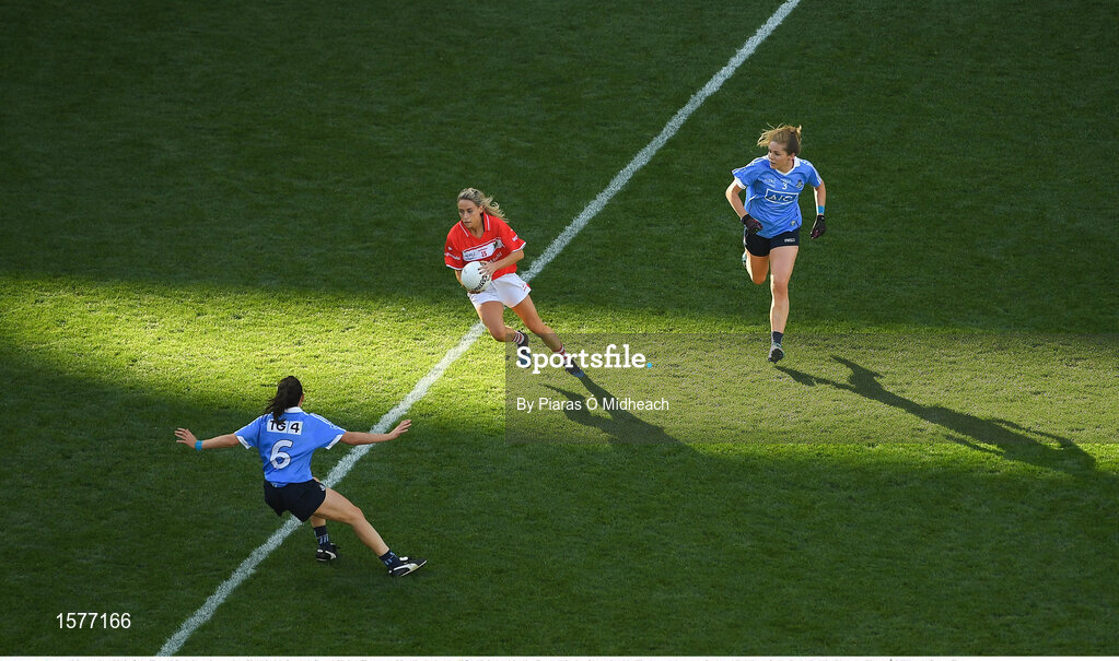 16 September 2018; Orla Finn of Cork in action against Siobhán McGrath, left, and Sinéad Finnegan of Dublin during the TG4 All-Ireland Ladies Football Senior Championship Final match between Cork and Dublin at Croke Park, Dublin. Photo by Piaras Ó Mídheach/Sportsfile