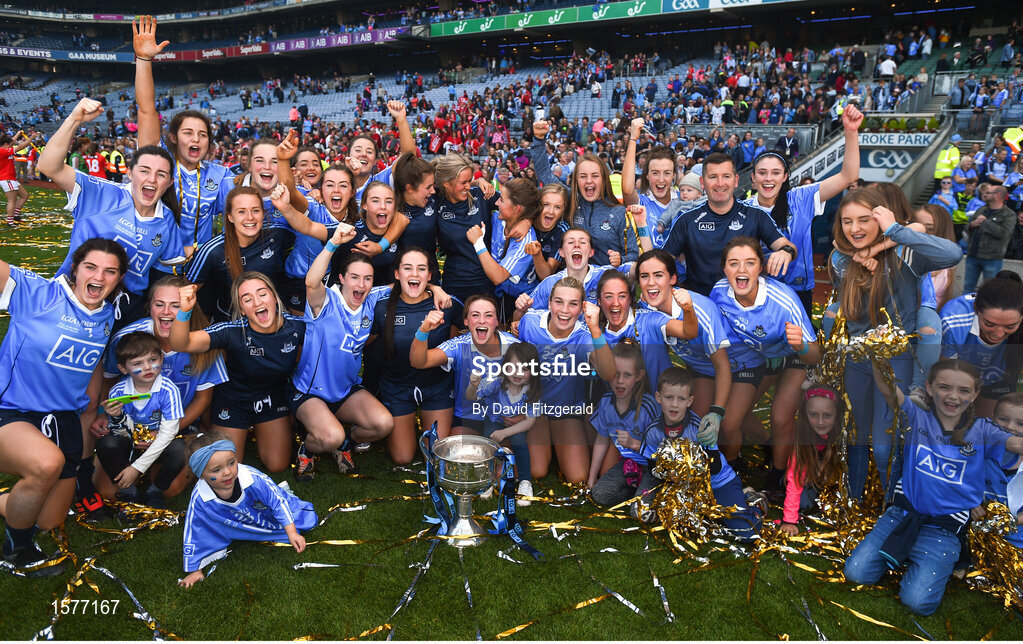 16 September 2018; The Dublin team celebrate with the Brendan Martin cup following the TG4 All-Ireland Ladies Football Senior Championship Final match between Cork and Dublin at Croke Park, Dublin. Photo by David Fitzgerald/Sportsfile