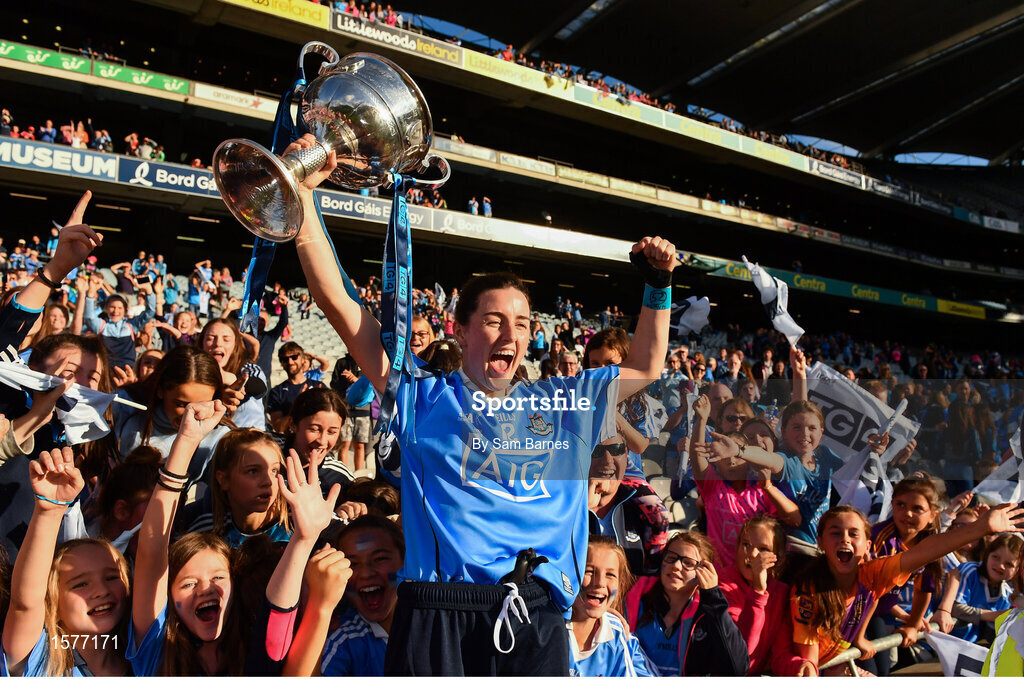 16 September 2018; Lyndsey Davey of Dublin celebrates with supporters and the Brendan Martin Cup following the TG4 All-Ireland Ladies Football Senior Championship Final match between Cork and Dublin at Croke Park, Dublin. Photo by Sam Barnes/Sportsfile