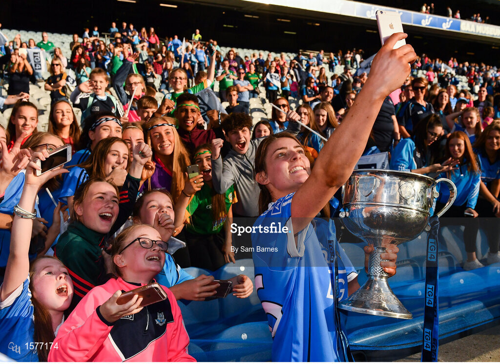 16 September 2018; Oonagh Whyte of Dublin takes a selfie with supporters and the Brendan Martin Cup following the TG4 All-Ireland Ladies Football Senior Championship Final match between Cork and Dublin at Croke Park, Dublin. Photo by Sam Barnes/Sportsfile