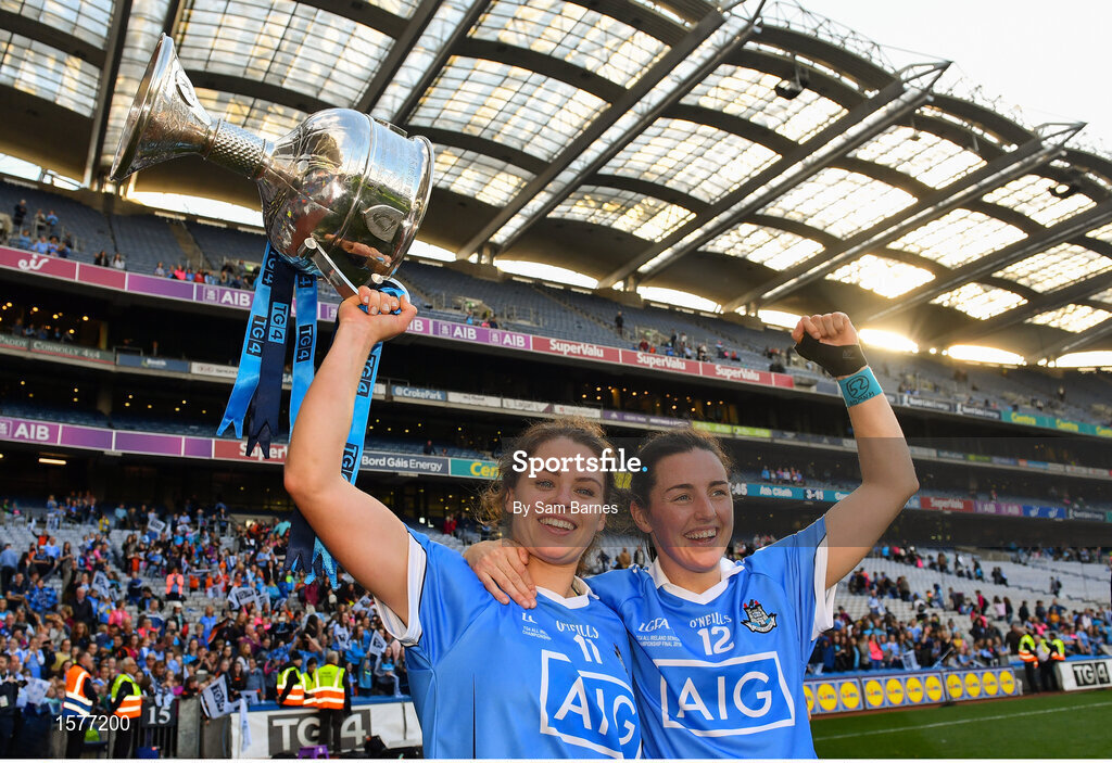 16 September 2018; Noelle Healy and Lyndsey Davey of Dublin celebrate with the Brendan Martin Cup following the TG4 All-Ireland Ladies Football Senior Championship Final match between Cork and Dublin at Croke Park, Dublin. Photo by Sam Barnes/Sportsfile