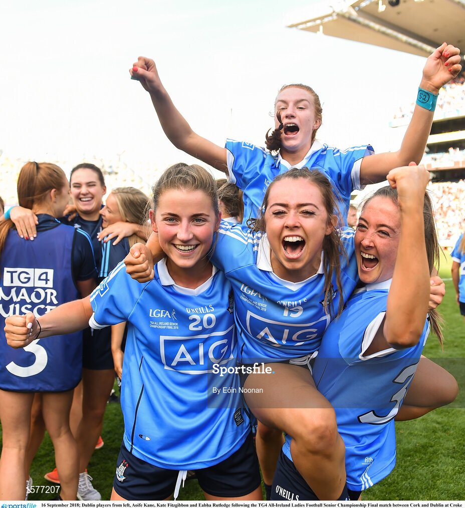 16 September 2018; Dublin players from left, Aoife Kane, Kate Fitzgibbon and Eabha Rutledge following the TG4 All-Ireland Ladies Football Senior Championship Final match between Cork and Dublin at Croke Park, Dublin. Photo by Eóin Noonan/Sportsfile