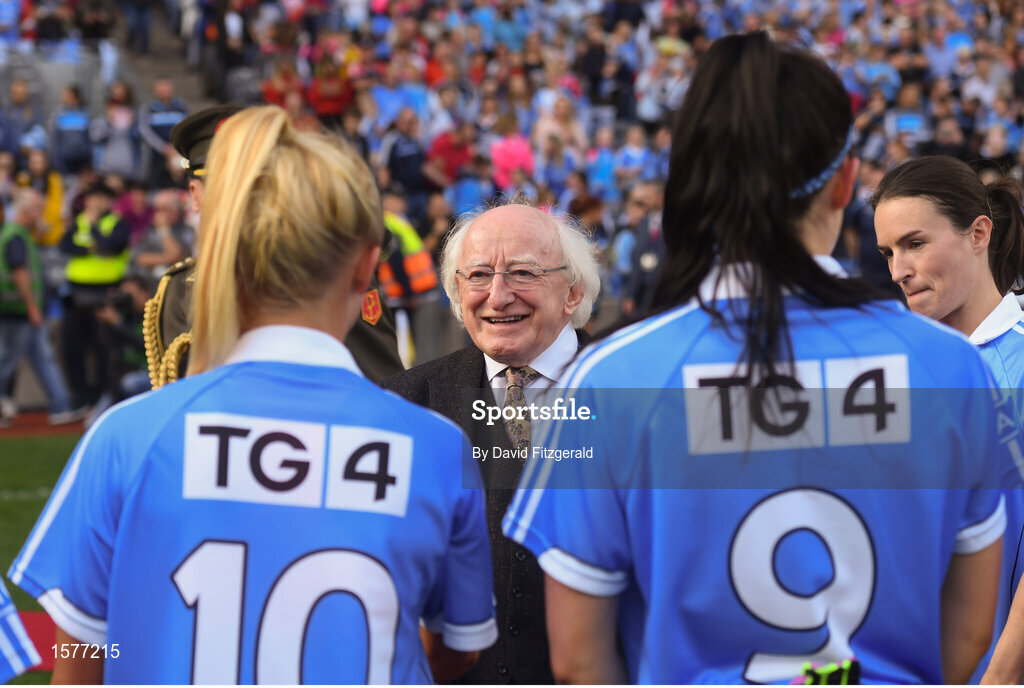 16 September 2018; President Michael D. Higgins meets Carla Rowe, left, and Olwen Carey of Dublin prior to the TG4 All-Ireland Ladies Football Senior Championship Final match between Cork and Dublin at Croke Park, Dublin. Photo by David Fitzgerald/Sportsfile