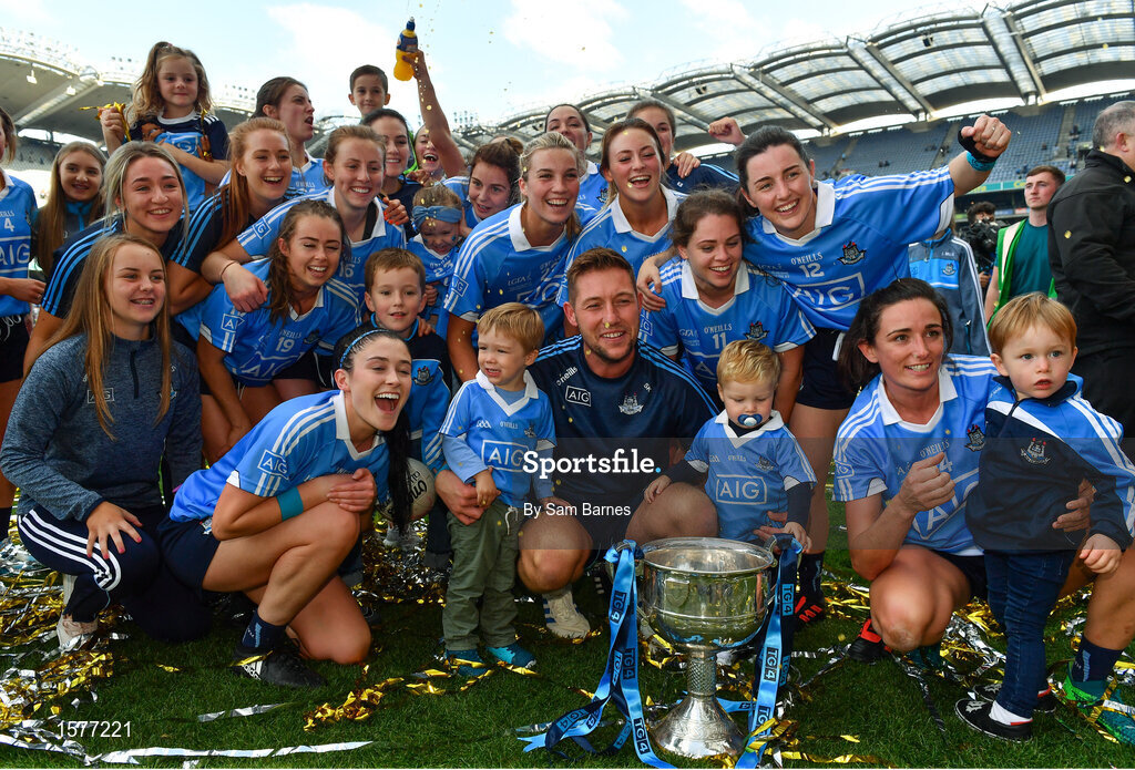 16 September 2018; Seaghan Kearney, and cousins Ollie and Eammon Kearney, celebrate with Dublin players and the Brendan Martin Cup following the TG4 All-Ireland Ladies Football Senior Championship Final match between Cork and Dublin at Croke Park, Dublin. Photo by Sam Barnes/Sportsfile