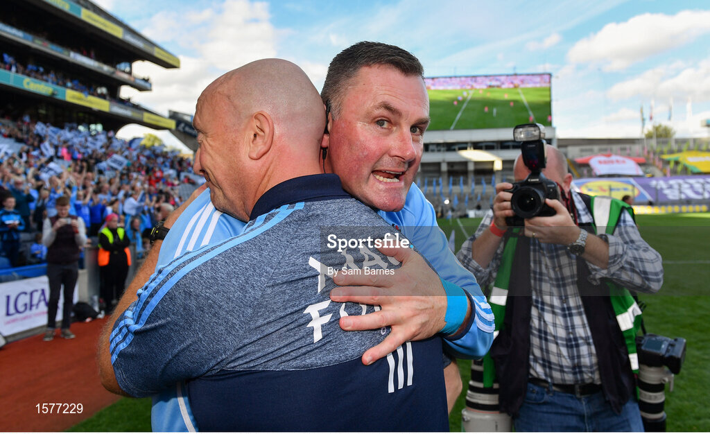 16 September 2018; Dublin manager Mick Bohan, right, and coach Ken Robinson celebrate following the TG4 All-Ireland Ladies Football Senior Championship Final match between Cork and Dublin at Croke Park, Dublin. Photo by Sam Barnes/Sportsfile