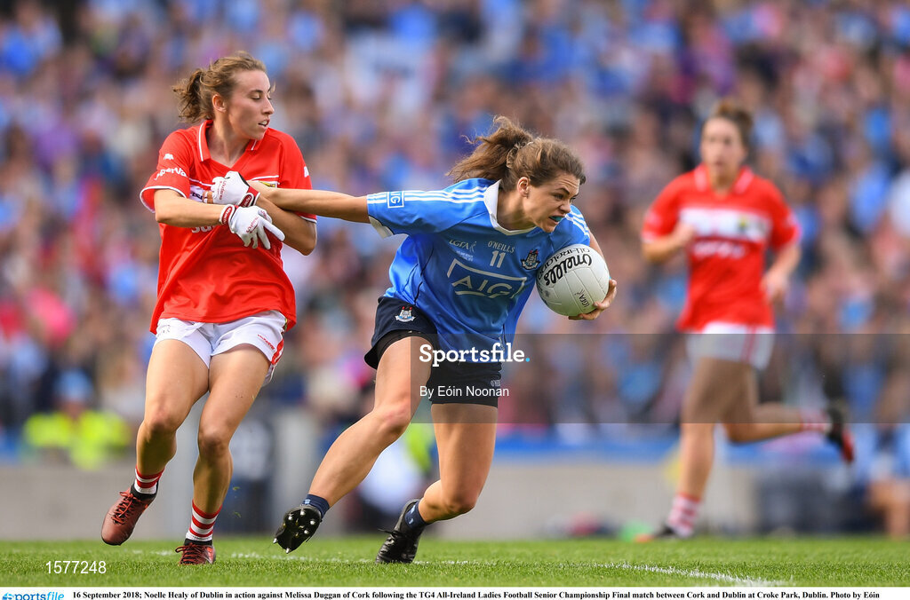 16 September 2018; Noelle Healy of Dublin in action against Melissa Duggan of Cork following the TG4 All-Ireland Ladies Football Senior Championship Final match between Cork and Dublin at Croke Park, Dublin. Photo by Eóin Noonan/Sportsfile