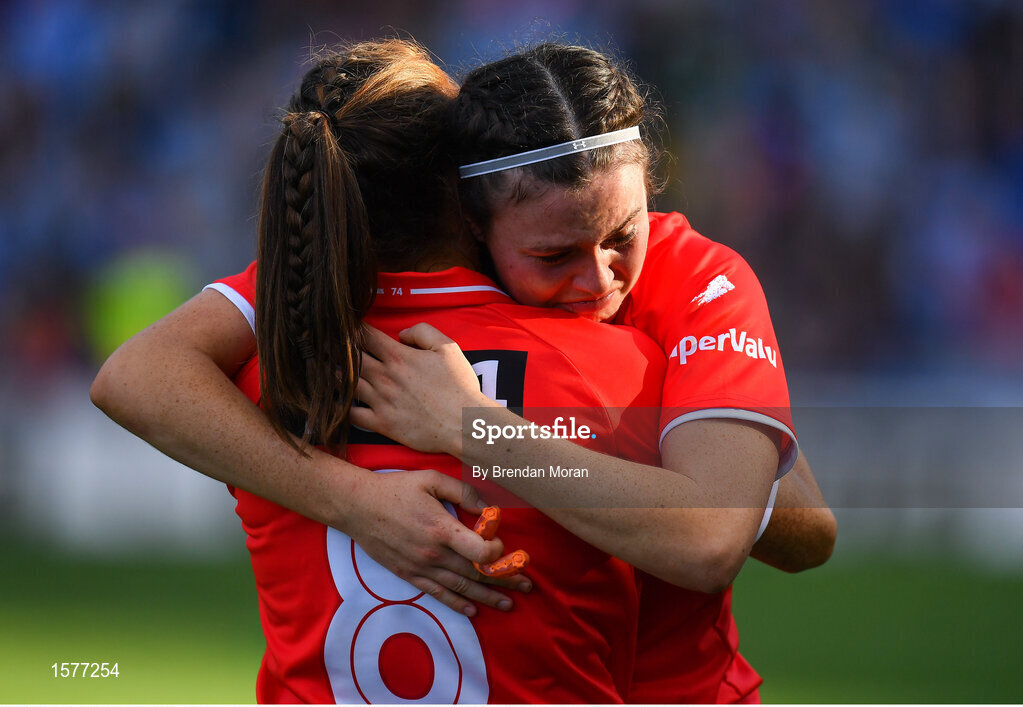 16 September 2018; Hannah Looney of Cork is consoled by team-mate Ashling Hutchings after the TG4 All-Ireland Ladies Football Senior Championship Final match between Cork and Dublin at Croke Park, Dublin. Photo by Brendan Moran/Sportsfile