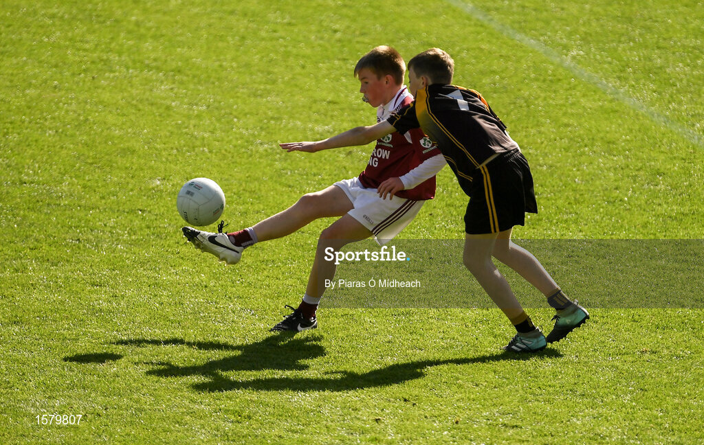 23 September 2018; Niall Kenny of Shamrock Gaels, Co Sligo, in action against Gearóid Markham of Ballinasloe, Co Galway, during the Littlewoods Ireland Connacht Provincial Days Go Games in Croke Park. This year over 6,000 boys and girls aged between six and eleven represented their clubs in a series of mini blitzes and – just like their heroes – got to play in Croke Park. For exclusive content and behind the scenes action follow Littlewoods Ireland on Facebook, Instagram, Twitter and https://blog.littlewoodsireland.ie/ Photo by Piaras Ó Mídheach/Sportsfile