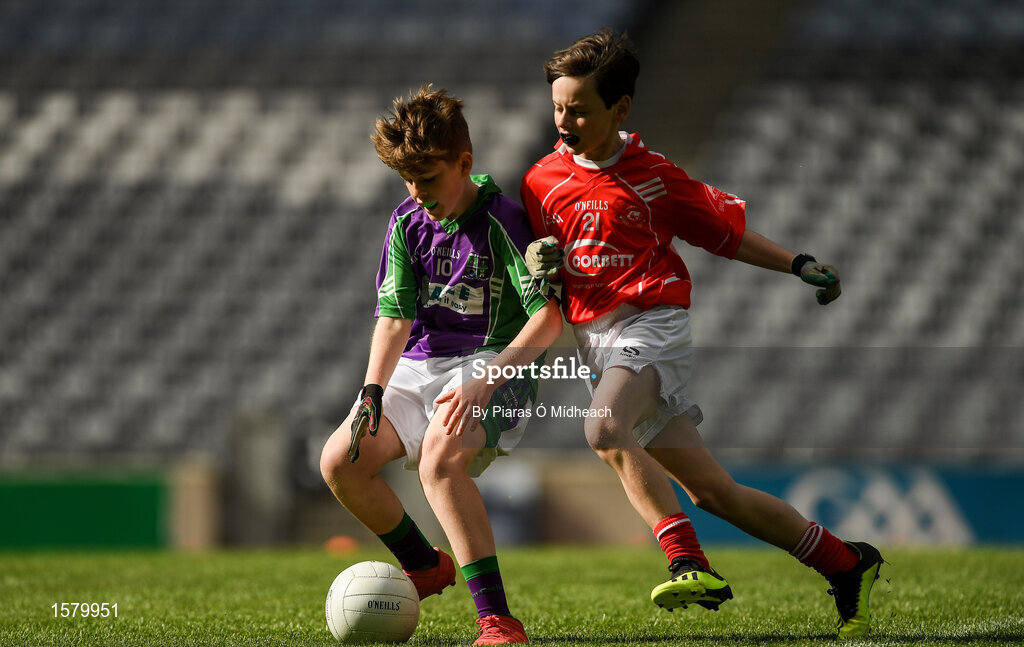 23 September 2018; Seán McKeown of Leitrim Gaels, Co Leitrim, left, in action against Ewan Loftus of Ballintubber, Co Mayo, during the Littlewoods Ireland Connacht Provincial Days Go Games in Croke Park. This year over 6,000 boys and girls aged between six and eleven represented their clubs in a series of mini blitzes and – just like their heroes – got to play in Croke Park. For exclusive content and behind the scenes action follow Littlewoods Ireland on Facebook, Instagram, Twitter and https://blog.littlewoodsireland.ie/ Photo by Piaras Ó Mídheach/Sportsfile