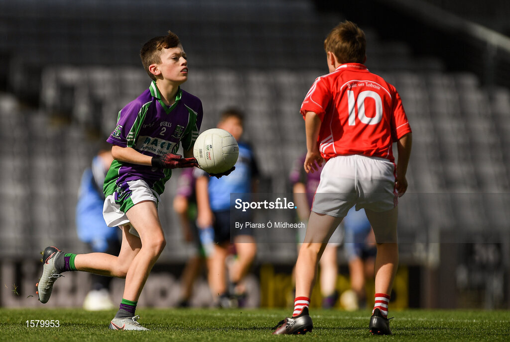 23 September 2018; Rosca McDaid of Leitrim Gaels, Co Leitrim, left, in action against Seán Mannion of Ballintubber, Co Mayo, during the Littlewoods Ireland Connacht Provincial Days Go Games in Croke Park. This year over 6,000 boys and girls aged between six and eleven represented their clubs in a series of mini blitzes and – just like their heroes – got to play in Croke Park. For exclusive content and behind the scenes action follow Littlewoods Ireland on Facebook, Instagram, Twitter and https://blog.littlewoodsireland.ie/ Photo by Piaras Ó Mídheach/Sportsfile