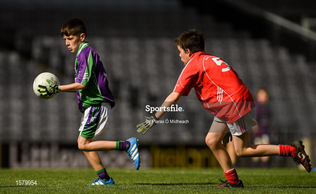 23 September 2018; Jay Keane of Leitrim Gaels, Co Leitrim, left, in action against William Hoban of Ballintubber, Co Mayo, during the Littlewoods Ireland Connacht Provincial Days Go Games in Croke Park. This year over 6,000 boys and girls aged between six and eleven represented their clubs in a series of mini blitzes and – just like their heroes – got to play in Croke Park. For exclusive content and behind the scenes action follow Littlewoods Ireland on Facebook, Instagram, Twitter and https://blog.littlewoodsireland.ie/ Photo by Piaras Ó Mídheach/Sportsfile