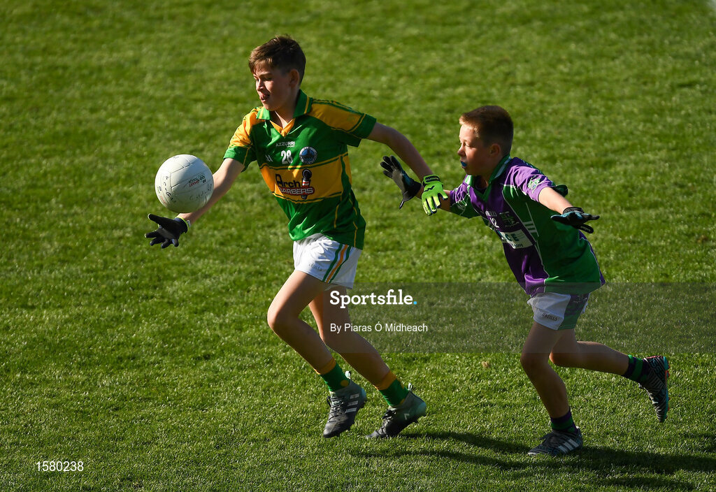 23 September 2018; Daniel Fitzmaurice of Claregalway, Co Galway, left, in action against Dorian Wozniak of Leitrim Gaels, Co Leitrim, during the Littlewoods Ireland Connacht Provincial Days Go Games in Croke Park. This year over 6,000 boys and girls aged between six and eleven represented their clubs in a series of mini blitzes and – just like their heroes – got to play in Croke Park. For exclusive content and behind the scenes action follow Littlewoods Ireland on Facebook, Instagram, Twitter and https://blog.littlewoodsireland.ie/ Photo by Piaras Ó Mídheach/Sportsfile