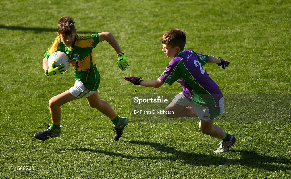 23 September 2018; Daniel Fitzmaurice of Claregalway, Co Galway, left, in action against Rosco McDaid of Leitrim Gaels, Co Leitrim, during the Littlewoods Ireland Connacht Provincial Days Go Games in Croke Park. This year over 6,000 boys and girls aged between six and eleven represented their clubs in a series of mini blitzes and – just like their heroes – got to play in Croke Park. For exclusive content and behind the scenes action follow Littlewoods Ireland on Facebook, Instagram, Twitter and https://blog.littlewoodsireland.ie/ Photo by Piaras Ó Mídheach/Sportsfile