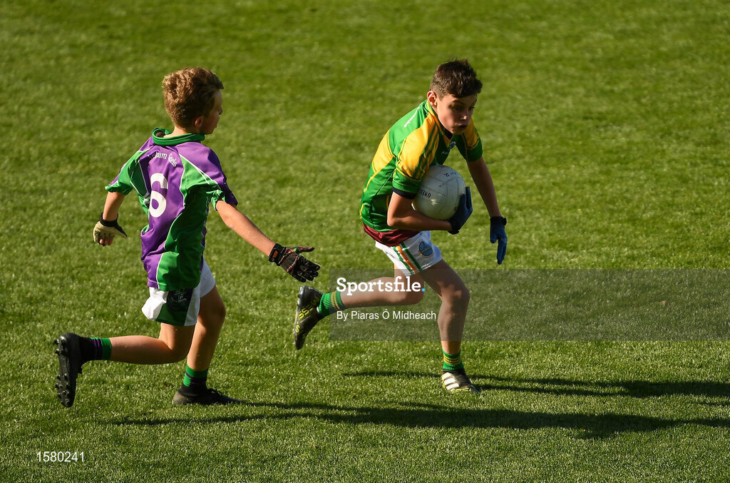 23 September 2018; Karl Murphy of Claregalway, Co Galway, in action against James Stenson of Leitrim Gales, Co Leitrim, during the Littlewoods Ireland Connacht Provincial Days Go Games in Croke Park. This year over 6,000 boys and girls aged between six and eleven represented their clubs in a series of mini blitzes and – just like their heroes – got to play in Croke Park. For exclusive content and behind the scenes action follow Littlewoods Ireland on Facebook, Instagram, Twitter and https://blog.littlewoodsireland.ie/ Photo by Piaras Ó Mídheach/Sportsfile
