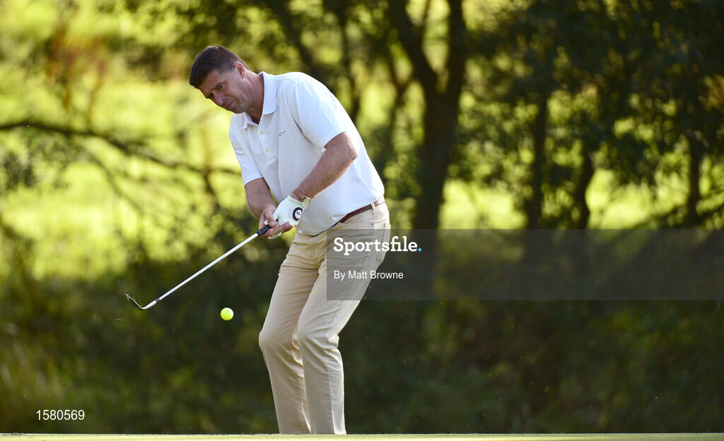 24 September 2018; Former Republic of Ireland international Niall Quinn pitches onto the 8th green during the Goodbody Jackie's Army Squad Reunion at The K Club, Straffan, in Co. Kildare. Photo by Matt Browne/Sportsfile