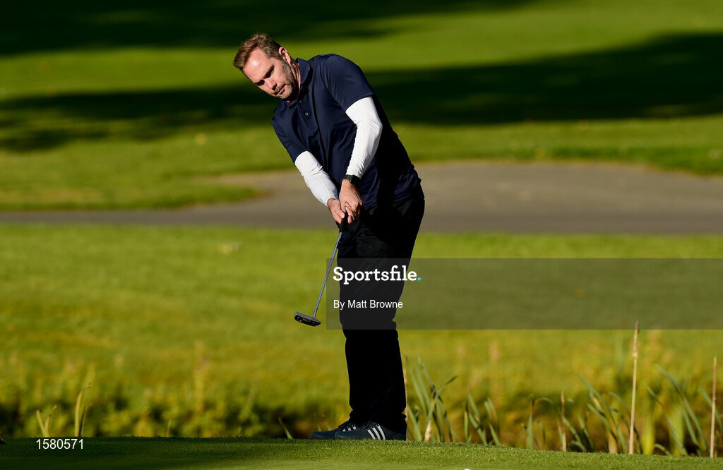 24 September 2018; Former Republic of Ireland international Jason McAteer watches his putt on the 10th green during the Goodbody Jackie's Army Squad Reunion at The K Club, Straffan, in Co. Kildare. Photo by Matt Browne/Sportsfile