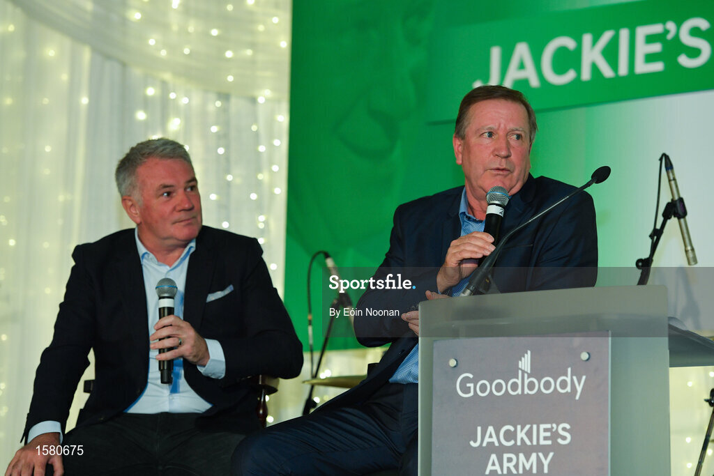 24 September 2018; Former Republic of Ireland players Ronnie Whelan, right, and Ray Houghton speaking with George Hamilton during the Goodbody Jackie's Army Squad Reunion at The K Club, Straffan, in Co. Kildare. Photo by Eóin Noonan/Sportsfile