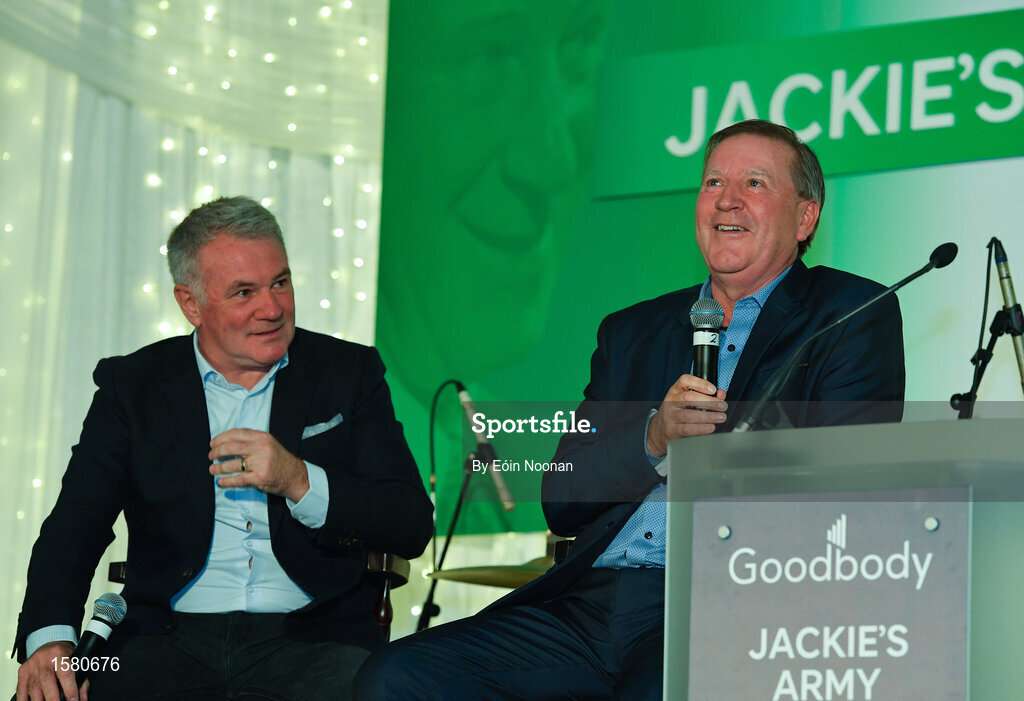 24 September 2018; Former Republic of Ireland players Ronnie Whelan, right, and Ray Houghton speaking with George Hamilton during the Goodbody Jackie's Army Squad Reunion at The K Club, Straffan, in Co. Kildare. Photo by Eóin Noonan/Sportsfile