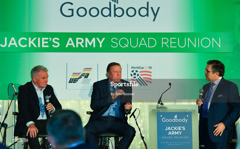 24 September 2018; Former Republic of Ireland players Ronnie Whelan, centre, and Ray Houghton, left, speaking with George Hamilton during the Goodbody Jackie's Army Squad Reunion at The K Club, Straffan, in Co. Kildare. Photo by Eóin Noonan/Sportsfile