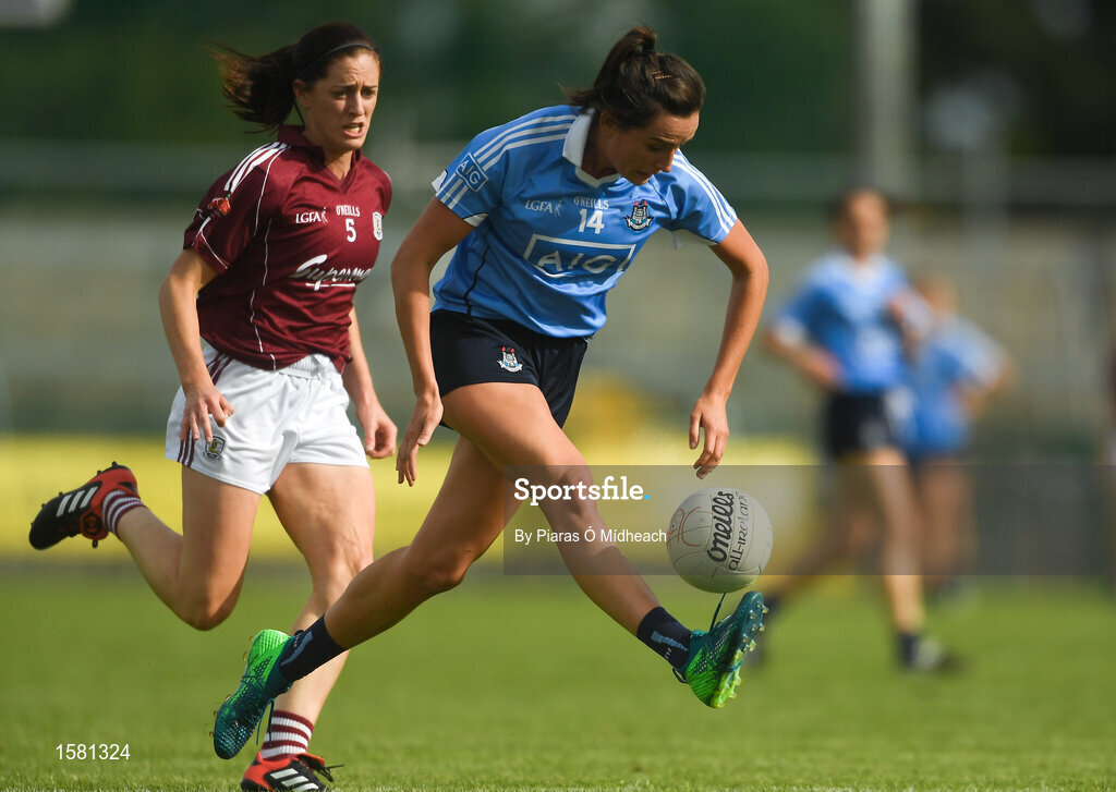 25 August 2018; Niamh McEvoy of Dublin in action against Emer Flaherty of Galway the TG4 All-Ireland Ladies Football Senior Championship Semi-Final match between Dublin and Galway at Dr Hyde Park in Roscommon. Photo by Piaras Ó Mídheach/Sportsfile