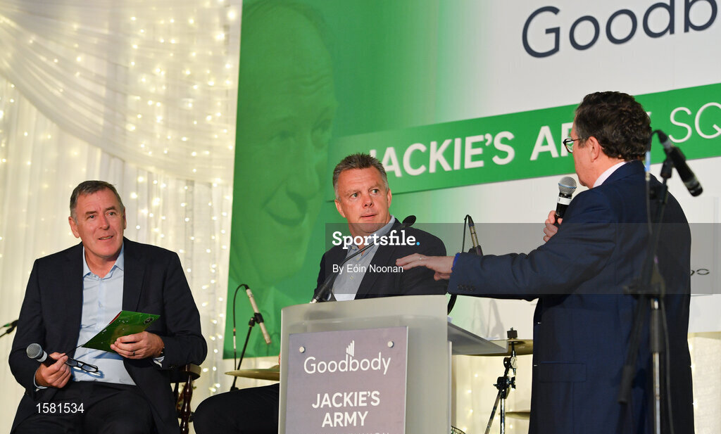 24 September 2018; Former Republic of Ireland players Packie Boner and David O'Leary speaking to George Hamilton during the Goodbody Jackie's Army Squad Reunion at The K Club, Straffan, in Co. Kildare. Photo by Eóin Noonan/Sportsfile