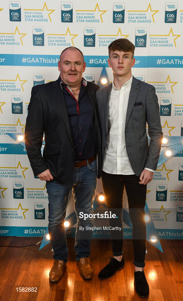 29 September 2018; Tiarnan Woods of Drumsurn, Derry, with Seamus Mullan on their arrival at the 2018 Electric Ireland Minor Star Awards. The Hurling/Football Team of the Year was selected by an expert panel of GAA legends including Ollie Canning, Sean Cavanagh, Michael Fennelly and Daniel Goulding. Sponsors of the GAA Minor Championships, Electric Ireland today recognised the talent and dedication of 15 Minor football players, and 15 Minor hurling players at the second annual Electric Ireland Minor Star Awards at Croke Park. #GAAThisIsMajor Photo by Stephen McCarthy/Sportsfile