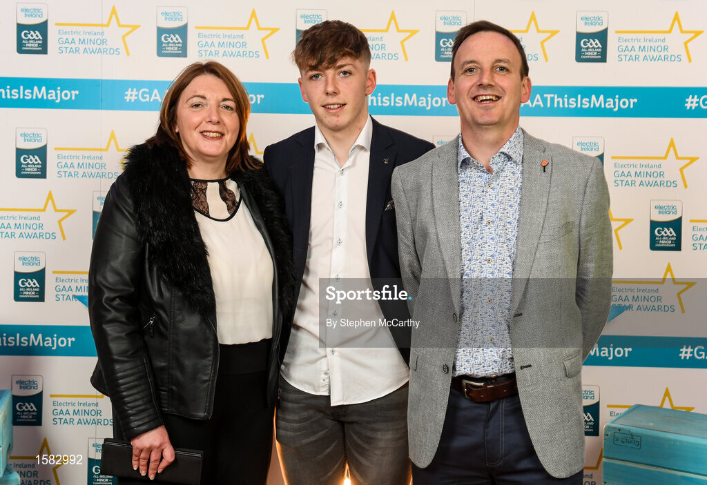 29 September 2018; Colm Moriarty of Annascaul, Kerry, with parents Trish and Paudie on their arrival at the 2018 Electric Ireland Minor Star Awards. The Hurling/Football Team of the Year was selected by an expert panel of GAA legends including Ollie Canning, Sean Cavanagh, Michael Fennelly and Daniel Goulding. Sponsors of the GAA Minor Championships, Electric Ireland today recognised the talent and dedication of 15 Minor football players, and 15 Minor hurling players at the second annual Electric Ireland Minor Star Awards at Croke Park. #GAAThisIsMajor Photo by Stephen McCarthy/Sportsfile