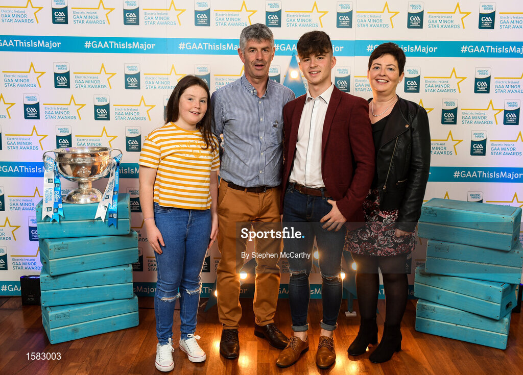 29 September 2018; Owen Fitzgerald of Gneeveguilla, Kerry, with parents Donie and Helen and sister Ava on their arrival at the 2018 Electric Ireland Minor Star Awards. The Hurling/Football Team of the Year was selected by an expert panel of GAA legends including Ollie Canning, Sean Cavanagh, Michael Fennelly and Daniel Goulding. Sponsors of the GAA Minor Championships, Electric Ireland today recognised the talent and dedication of 15 Minor football players, and 15 Minor hurling players at the second annual Electric Ireland Minor Star Awards at Croke Park. #GAAThisIsMajor Photo by Stephen McCarthy/Sportsfile