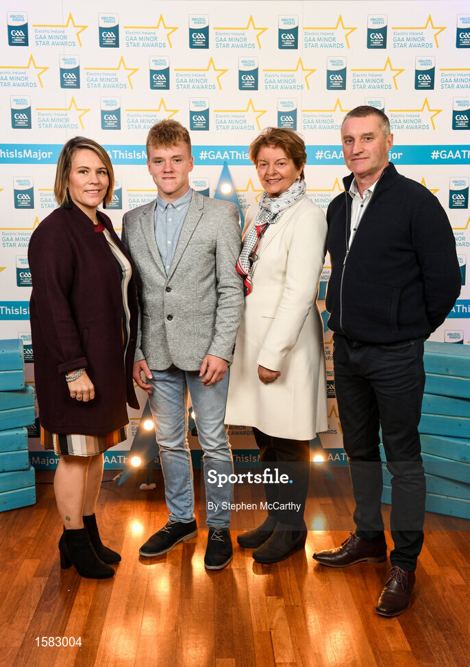 29 September 2018; James Devaney of Borris-Ileigh, Tipperary, with family, from left, Tracey, Hannah and Seamus on their arrival at the 2018 Electric Ireland Minor Star Awards. The Hurling/Football Team of the Year was selected by an expert panel of GAA legends including Ollie Canning, Sean Cavanagh, Michael Fennelly and Daniel Goulding. Sponsors of the GAA Minor Championships, Electric Ireland today recognised the talent and dedication of 15 Minor football players, and 15 Minor hurling players at the second annual Electric Ireland Minor Star Awards at Croke Park. #GAAThisIsMajor Photo by Stephen McCarthy/Sportsfile
