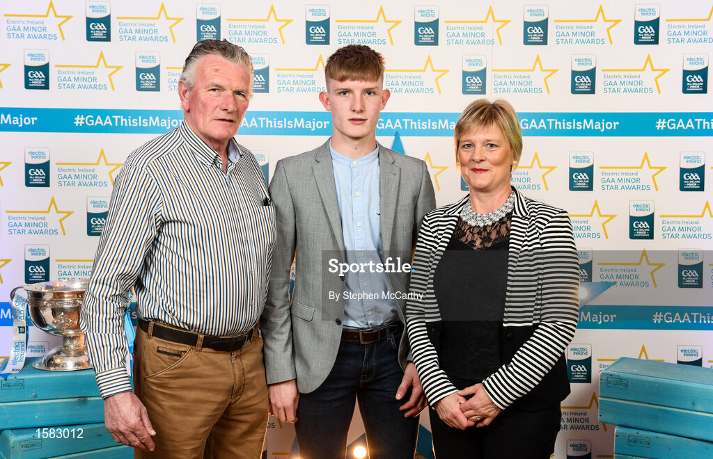 29 September 2018; Conor Raftery of Northern Gaels, Galway, with parents John and Kathleen on their arrival at the 2018 Electric Ireland Minor Star Awards. The Hurling/Football Team of the Year was selected by an expert panel of GAA legends including Ollie Canning, Sean Cavanagh, Michael Fennelly and Daniel Goulding. Sponsors of the GAA Minor Championships, Electric Ireland today recognised the talent and dedication of 15 Minor football players, and 15 Minor hurling players at the second annual Electric Ireland Minor Star Awards at Croke Park. #GAAThisIsMajor Photo by Stephen McCarthy/Sportsfile