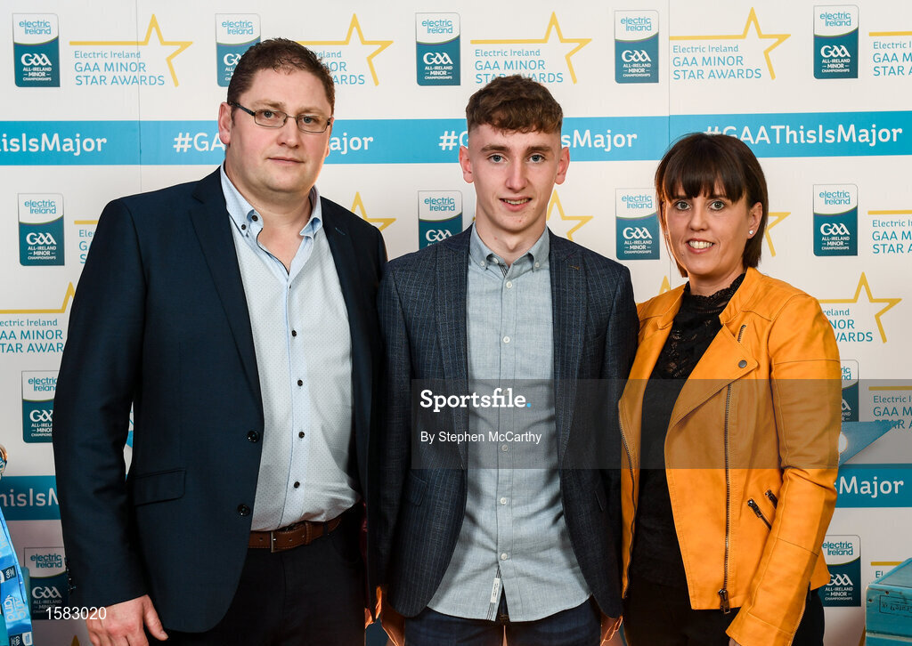 29 September 2018; Matthew Cooley of Corofin, Galway, with father Brian and mother Helen on their arrival at the 2018 Electric Ireland Minor Star Awards. The Hurling/Football Team of the Year was selected by an expert panel of GAA legends including Ollie Canning, Sean Cavanagh, Michael Fennelly and Daniel Goulding. Sponsors of the GAA Minor Championships, Electric Ireland today recognised the talent and dedication of 15 Minor football players, and 15 Minor hurling players at the second annual Electric Ireland Minor Star Awards at Croke Park. #GAAThisIsMajor Photo by Stephen McCarthy/Sportsfile